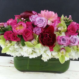 Price: $185.00 Enchanting Blossoms: Pink, Purple, and Green Floral Arrangement Product Tags: Same-day Delivery