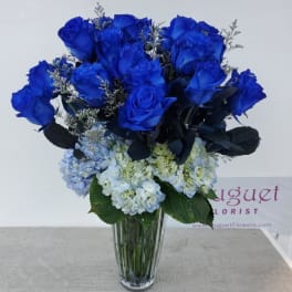 Price: $225.00 Azure Dreams: Blue Roses and Hydrangeas Tall Vase Arrangement Product Tags: Same-day Delivery