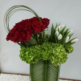Price: $298.00 Eternal Valentine's Embrace: A Bouquet of Red Roses, Tulips, Hydrangeas, and Seasonal Greenery Product Tags: Same-day Delivery